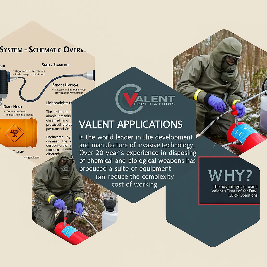 At Valent, we develop and manufacture special equipment for the investigation and disposal of toxic hazards found in defence and civilian sectors. Our technology allows fully sealed access into containers, vessels and systems to enable safe sampling, extraction or neutralisation of hazardous contents. We supply these systems for CBRN, HazMat, decommissioning, defence & civilian markets. We provide bespoke engineering solutions for highly challenging problems, with over 60% of work in R&D projects. We offer products such as the MAMBA and VIPER systems - find out more by downloading our brochures below.